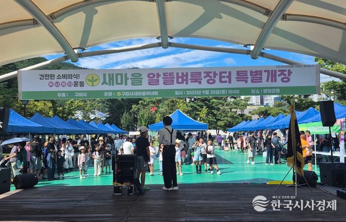 이번 장터는 구미시새마을부녀회 주관으로 마련됐다. 현장에는 시민들이 직접 참여하는 3,000원 이하 중고물품 판매 부스를 비롯해 반려식물 심기, 친환경 생활소품 만들기, 전래놀이 등 다채로운 체험 프로그램이 운영됐다. 아이들을 위한 어린이 밸리댄스와 마술 공연도 펼쳐져 가족 단위 관람객들의 발길이 이어졌다.