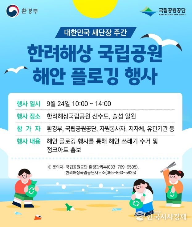 한국시사경제 이정이 기자 | 환경부 산하 국립공원공단(이사장 주대영)은 ‘대한민국 새단장’ 주간(9월 22일~10월 1일)을 맞아 국립공원 바닷가를 대상으로 쓰레기줍기(플로깅) 활동과 전 국민이 참여하는 사회관계망서비스(SNS) 인증 행사를 진행한다고 밝혔다.