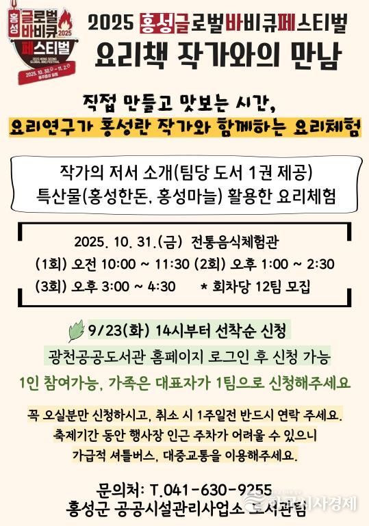 이번 행사는 2025 홍성글로벌바비큐페스티벌과 연계해 지역 특산물을 활용한 요리 체험과 작가와의 소통을 통해 독서문화 확산과 농·특산물 홍보를 함께 추진한다.