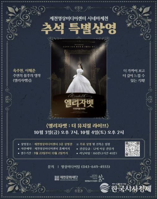 한국시사경제 충북취재본부 | 제천문화재단이 추석 연휴 기간인 10월 3일 오후 7시와 10월 4일 오후 2시, 제천영상미디어센터 3층 상영관에서 옥주현 주연의 뮤지컬 공연 실황 영화 '엘리자벳 : 더 뮤지컬 라이브'를 무료 상영한다.