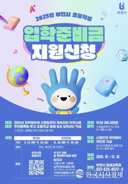 한국시사경제 경기취재본부 | 부천시는 2025학년도 초등학교에 입학한 신입생을 대상으로, 가정의 교육비 부담을 덜고 원활한 학교생활 적응을 돕기 위해 1인당 10만 원의 입학준비금을 부천페이로 지급한다고 밝혔다.