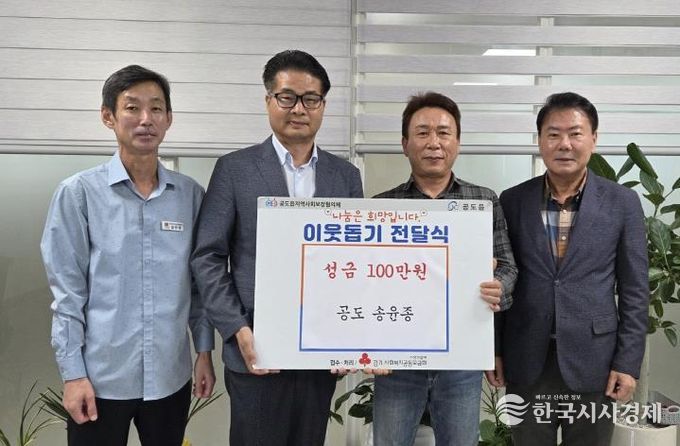 한국시사경제 경기취재본부 | 안성시 공도읍에 거주하는 개인 기탁자 송윤종씨가 25년 9월 19일 어려운 이웃을 돕기 위해 개인 성금 100만원을 기탁했다. 이번 성금은 공도읍 내 취약계층 지원과 복지사각지대 해소를 위해 사용될 예정이다.