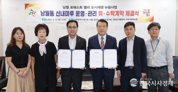 한국시사경제 대전취재본부 | 대전 동구는 22일 구청장 접견실에서 식장산 마을관리 사회적협동조합(대표 박기병)과 낭월동 도시재생 거점시설인 ‘산내마루’의 운영·관리를 위한 위·수탁 협약을 체결하고 본격 운영에 들어간다고 밝혔다.