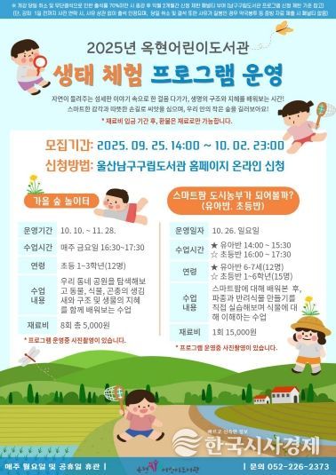 한국시사경제 울산취재본부 | 남구 옥현어린이도서관은 어린이들을 위한 ‘2025년 생태 체험프로그램’을 오는 10월 10일부터 11월 28일까지 운영한다고 밝혔다.