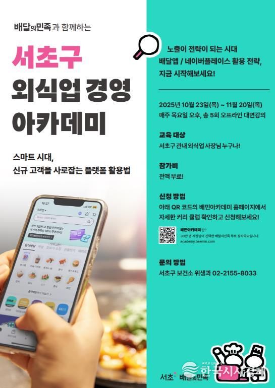 서초구와 ㈜우아한형제들의 외식업 교육 플랫폼인 ‘배민아카데미’가 공동 주관하는 ‘외식업 경영 아카데미’는 물가 상승, 인건비 부담, 경기 침체 등으로 어려움을 겪고 있는 지역 내 외식업 경영자를 대상으로 급변하는 외식시장 환경에 능동적으로 대응할 수 있도록 돕는 교육 프로그램이다. 양 기관이 지난 6월 체결한 업무협약을 기반으로 기획된 이번 교육은 이론부터 실전까지 아우르는 커리큘럼을 통해 실질적인 경영 전략과 플랫폼 활용법 등을 체계적으로 제공한다.