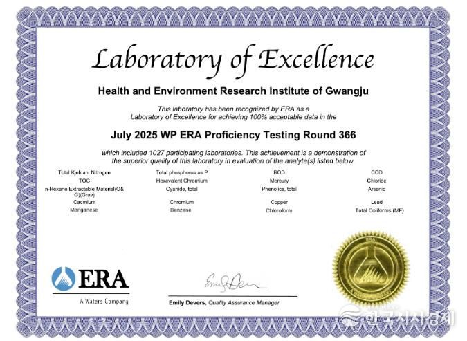 한국시사경제 광주취재본부 | 광주광역시 보건환경연구원이 최근 미국 환경자원협회(ERA)가 주관한 수질분야 국제 숙련도시험에서 전 항목 ‘만족(Satisfactory)’ 판정을 받아 ‘2025 최우수 분석기관(Laboratory of Excellence)’으로 선정됐다.
