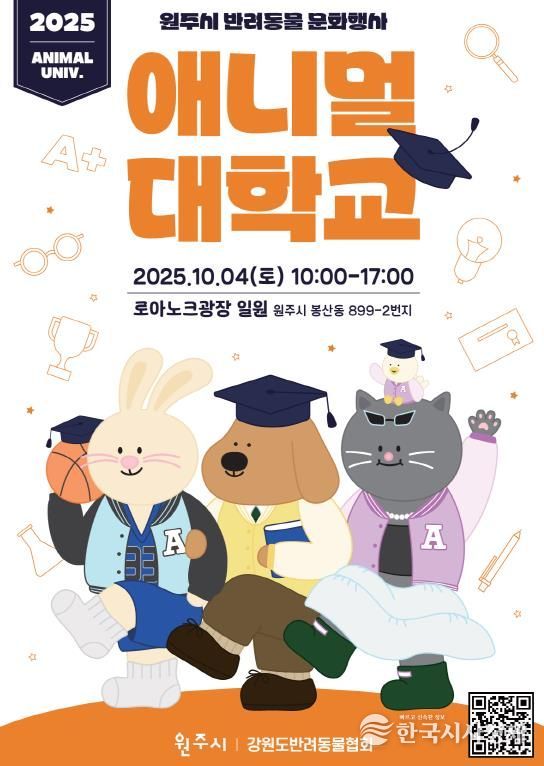 한국시사경제 이정이 기자 | 원주시농업기술센터는 10월 4일 오전 10시 원주천 로아노크광장에서 반려동물 문화행사 ‘애니멀 대학교’를 개최한다.