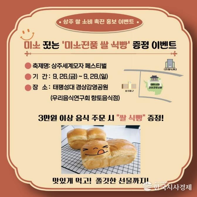 이벤트 행사는 9월 26일부터 9월 28일까지 진행되는 상주세계모자 페스티벌과 10월 18일부터 10월 19일까지 진행되는 상주슬로라이프 페스티벌 두 번에 걸쳐서 추진할 계획이다. 행사 장소는 축제장 내 우리음식연구회 향토음식 판매부스며, 3만원 이상 주문 시 ‘미소진품 쌀 식빵’을 축제기간 중 매일 50개씩 총 250개를 선착순으로 무료 증정할 예정이다.