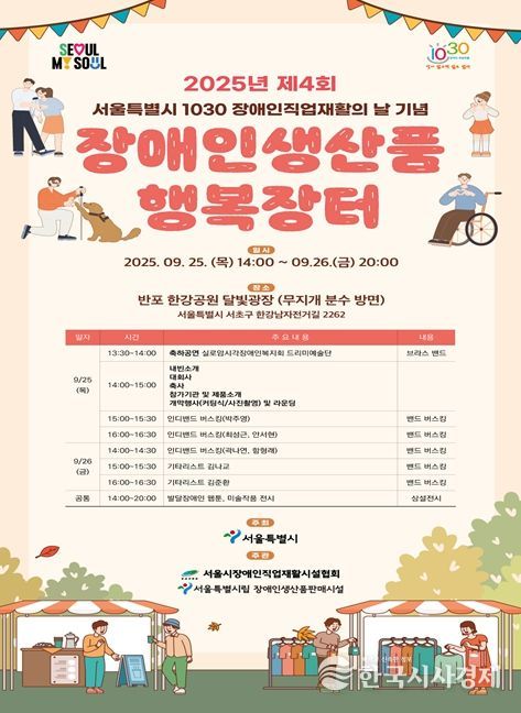 '2025년 제4회 장애인직업재활의 날 기념 행복장터'는 25일, 26일 이틀간 반포한강공원 달빛광장에서 열리며 시민 누구나 참여해 즐길 수 있고, 장애인과 비장애인이 함께하는 화합의 장으로 운영된다.