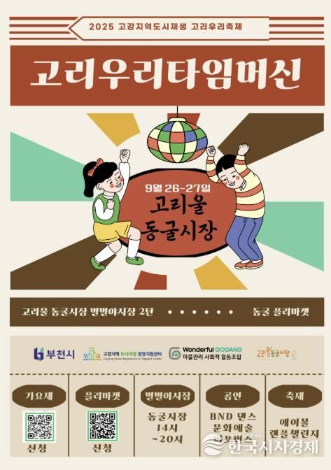 한국시사경제 경기취재본부 | 부천시는 9월 26일부터 27일까지 이틀간 오정구 고리울 동굴시장에서 ‘2025 고리우리축제’를 연다고 23일 밝혔다. 이번 행사는 부천시 원도심재생과가 주최하고 원더풀고강마을관리 사회적협동조합이 주관한다.