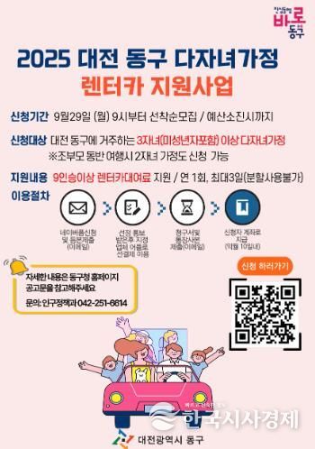 한국시사경제 대전취재본부 | 대전 동구는 다자녀 가정의 여가활동 지원과 아이 키우기 좋은 환경 조성을 위해 ‘2025년 다자녀 가정 렌터카 지원사업’을 본격 추진, 이달 29일부터 참여자를 모집한다고 밝혔다.