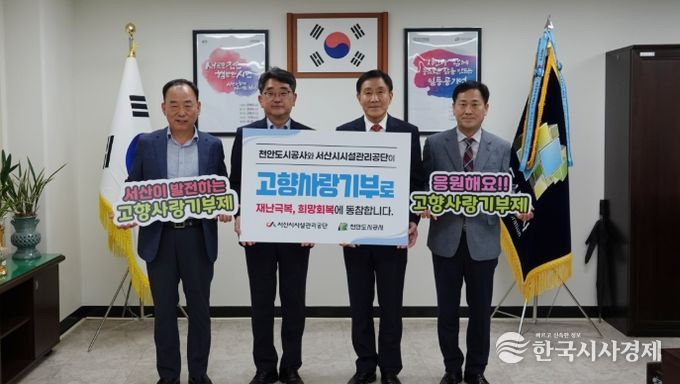 한국시사경제 충남취재본부 | 천안도시공사는 23일 서산시시설관리공단과 ‘고향사랑기부제 상호기부금 기탁식’을 개최했다고 밝혔다.