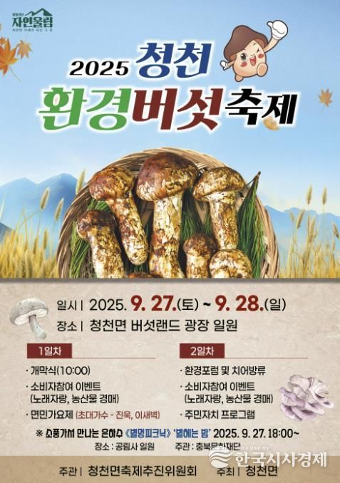 한국시사경제 충북취재본부 | 충북 괴산군 청천면의 대표 지역축제인 ‘2025 청천환경버섯축제’가 오는 27일부터 28일까지 이틀간 청천 버섯랜드 광장 일원에서 열린다.
