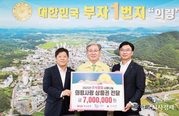 한국시사경제 윤광희 기자 | 의령군은 BNK경남은행 의령지점(서부영업본부장 임재문, 지점장 김두용)에서 추석을 맞이하여 23일 의령군청을 방문해 의령사랑상품권 1만원권 700장(700만원 상당)을 전달했다고 밝혔다.