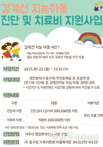 지원 대상은 동구에 주소를 둔 초등학생(만 7~12세) 중 경계선지능 의심 아동 20명 내외이며, 사업 기간은 2025년 12월 31일까지다.