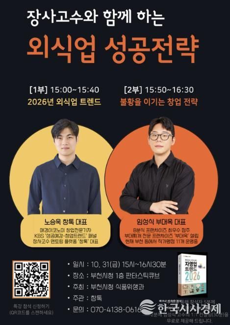 부천시는 이번 특강이 외식업 현장의 생생한 경험과 미래 전략을 동시에 얻는 기회가 될 것으로 보고 있다. 아울러 현장 참석자 중 추첨을 통해 ‘자영업 트렌드 2026(매경이코노미·창톡고수 지음)’ 신간 도서 5권을 증정하며, 임성식 대표의 무료 개인 맞춤 컨설팅도 함께 제공한다.