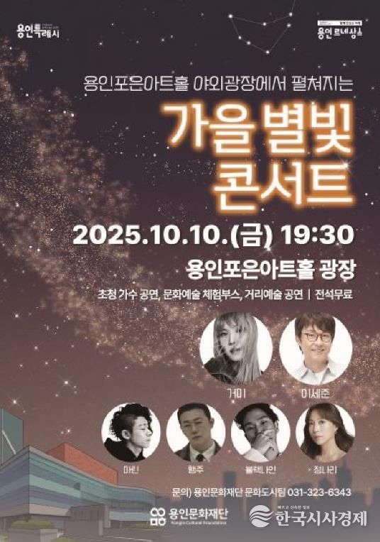 한국시사경제 이정이 기자 | 용인문화재단은 오는 10월 10일 오후 7시 30분, 새롭게 단장한 용인포은아트홀 야외광장에서 ‘가을 별빛 콘서트’를 개최한다. 이번 공연은 가을밤의 정취 속에서 시민들에게 특별한 추억을 선사하고, 용인의 대표 광장형 축제를 알리기 위해 마련됐다.
