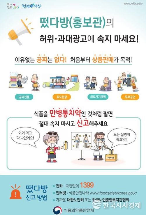 점검반은 △건강기능식품 및 일반식품을 질병 치료에 효과가 있는 것처럼 광고해 판매하는 행위(허위·과대 광고 행위) 단속 △어르신들이 허위·과대광고에 현혹되지 않도록 홍보 및 계몽 활동 실시 △허위·과대 광고 예방을 위한 안내문 부착 등을 진행한다.
