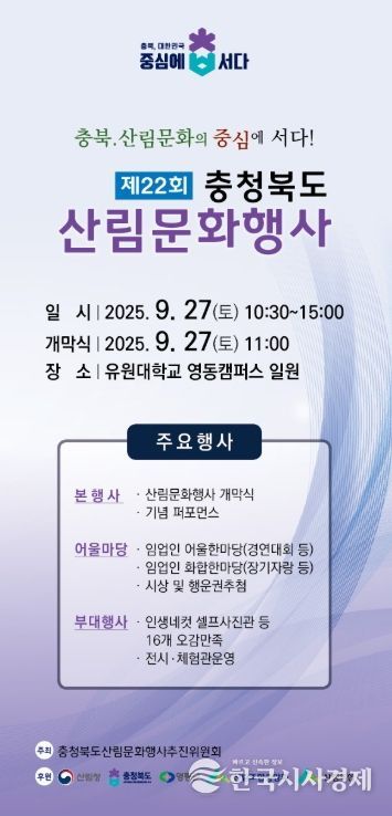 한국시사경제 충북취재본부 | 제22회 충청북도 산림문화행사가 오는 27일 오전 10시 30분부터 영동군 유원대학교 영동캠퍼스 일원(영동읍 대학로 310)에서 열린다.