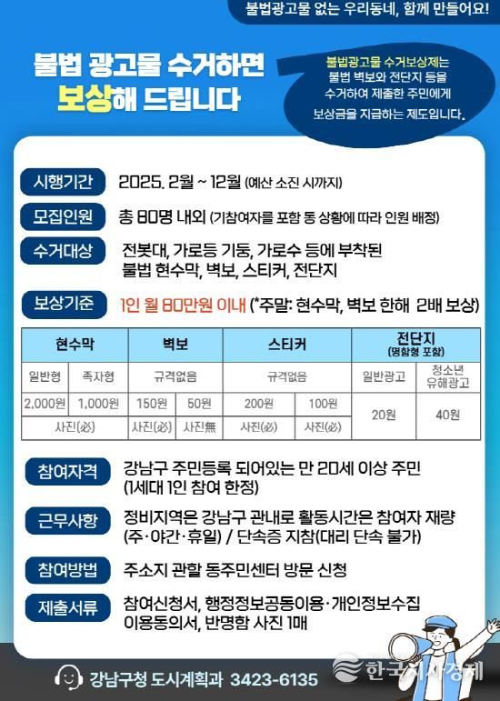 한국시사경제 이정이 기자 | 꿈이 모이는 도시, 미래를 그리는 강남구가 불법 유동광고물 근절을 위해 운영 중인 ‘수거보상제’의 참여 인원을 대폭 확대한다. 구는 주민 약 60명을 새롭게 모집해 더 많은 주민이 직접 거리 정비에 나설 수 있도록 했다.
