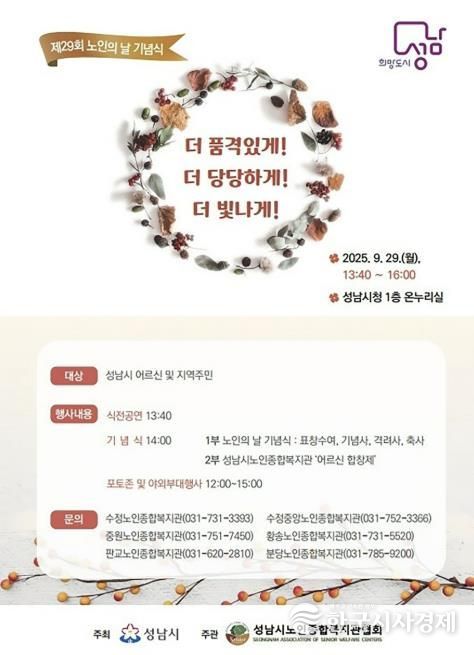 한국시사경제 경기취재본부 | 성남시는 ‘제29회 노인의 날(10.2)’을 맞아 오는 9월 29일 오후 1시 40분 시청 1층 온누리에서 “더 품격있게! 더 당당하게! 더 빛나게!”를 주제로 기념행사를 연다.