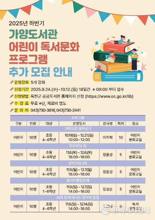 한국시사경제 오영주 기자 | 옥천 가양도서관은 군민의 독서문화활동을 지원하기 위해 하반기 어린이 독서문화프로그램 수강생을 추가 모집한다.