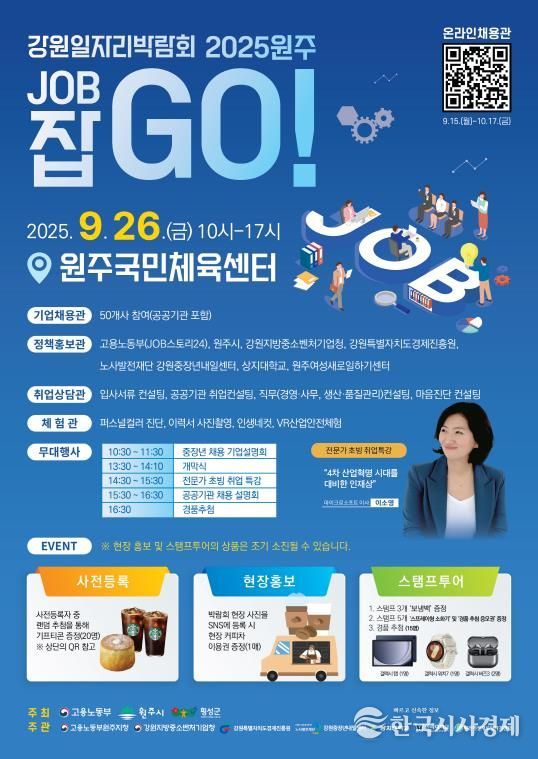 한국시사경제 이정이 기자 | 원주시와 고용노동부는 오는 26일 오전 10시부터 오후 5시까지 원주국민체육센터에서 ‘강원일자리박람회 2025 원주 잡(JOB) GO!’를 개최한다.