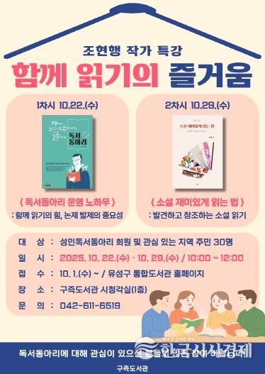 한국시사경제 대전취재본부 | 대전 유성구는 10월 22일과 29일 이틀간 구즉도서관에서 문학칼럼니스트 조현행 작가를 초청해 ‘함께 읽기의 즐거움’ 특강을 개최한다.