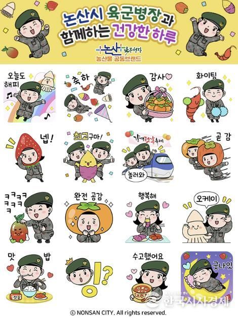 ‘논산시 육군병장과 함께하는 건강한 하루’라는 주제로 제작된 이모티콘은 논산시 농산물 공동브랜드 마스코트 ‘육군병장’과 딸기, 대추, 고구마, 젓갈, 곶감 등 지역 대표 농특산물을 소재로 제작됐다. 일상 대화 속에서 친근하고 재치 있게 사용할 수 있는 디자인을 통해 논산의 건강한 농특산물을 자연스럽게 홍보할 수 있는 것이 특징이다.