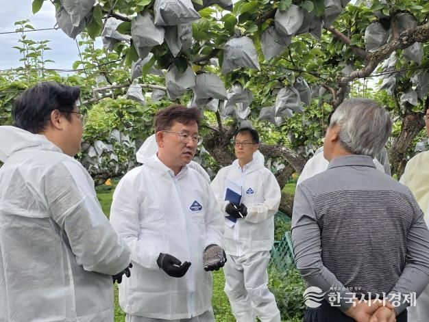 한국시사경제 경기취재본부 | 농촌진흥청 이승돈 청장은 지난 9월 23일 경기도 안성시 공도읍 소재 배 과수원을 방문해 생육 및 출하 상황을 점검하고, “수확 적기 판단과 철저한 수확 후 관리로 과수 안정 생산에 힘써 달라”고 격려했다.