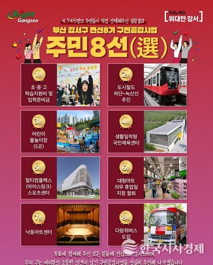 한국시사경제 부산취재본부 | 부산 강서구는 민선8기 3년간 추진한 주요 사업 가운데 주민이 직접 선정한 ‘주민 8선(選)’을 발표했다. 이번 조사는 지난 8월 14일부터 9월 13일까지 구 홈페이지(PC 또는 모바일)를 통한 온라인 설문 방식으로 진행됐으며, 총 4,745명이 참여해 큰 관심을 모았다.