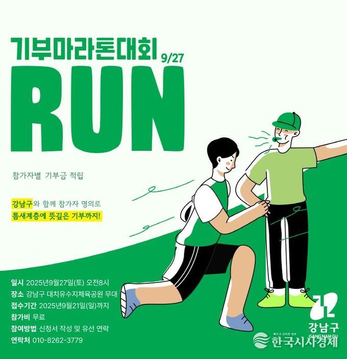 한국시사경제 권충현 기자 | 꿈이 모이는 도시, 미래를 그리는 강남구가 오는 9월 27일 오전 9시부터 오후 2시 30분까지 양재천 일대에서 ‘기부-Run 강남 달리기’ 행사를 개최한다. 이 행사는 참가자의 걸음과 달리기가 기부로 이어지는 기부 연계형 건강 캠페인으로, 건강한 나눔을 실천하는 지역사회 공헌 프로그램이다.