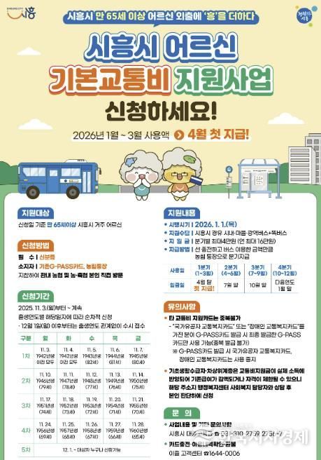 이번 사업은 시흥시에 거주하는 만 65세 이상 어르신들에게 실제 사용한 교통비를 분기별로 최대 4만 원(연 최대 16만 원)을 지원한다. 사전 신청은 오는 11월 3일부터 시작되며, 2026년 1월 1일 이후 사용분부터 적용해 같은 해 4월 말 첫 지급이 이뤄질 예정이다.