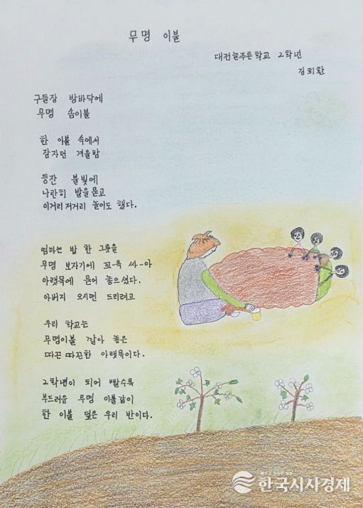 전국 시화전은 ‘문해, 세상이 달라 보여요’라는 주제로 열렸으며, 성인 문해 학습자들이 글을 배우며 경험한 일상의 변화와 감정을 진솔하게 담아냈다. 수상작 '무명 이불'은 과거 가족과의 따뜻한 기억을 떠올리며, 현재 배움터에서 느끼는 정서적 감정을 부드럽고 따뜻한 문장으로 풀어낸 작품이다.
