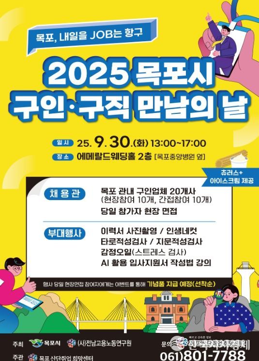 이번 행사는 목포시가 주최하고 (사)전남고용노동연구원이 주관하며, 지역 구인기업 20개사가 참여해 기업 설명회와 현장 면접을 진행한다.