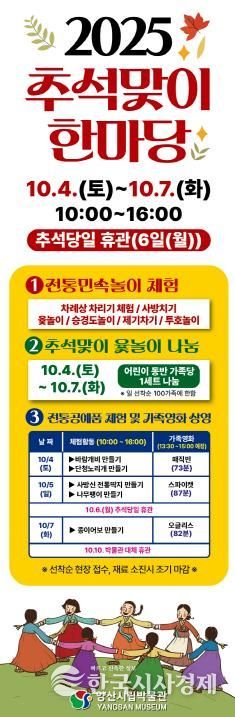 한국시사경제 윤경수 기자 | 양산시립박물관은 민족 최대의 추석 명절을 맞이하여 오는 10월 4일부터 7일까지 3일간 ‘2025년 추석맞이 놀이 한마당’을 운영한다고 밝혔다.