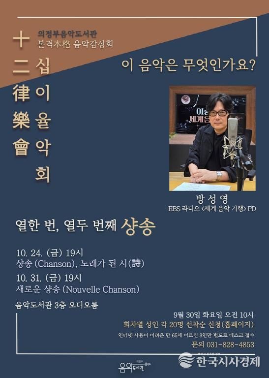 한국시사경제 윤광희 기자 | 의정부음악도서관은 음악 전문가의 해설과 함께하는 음악감상회 ‘십이율악회(十二律樂會)’를 10월에도 운영한다.