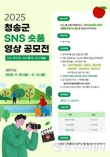 한국시사경제 이정이 기자 | 청송군은 산소카페 청송군의 대표 관광지와 축제를 널리 알리고 온라인 홍보를 활성화하기 위해 '2025 청송군 SNS 숏폼 영상 공모전'을 개최한다고 밝혔다.
