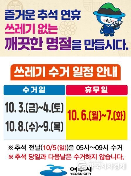 한국시사경제 전남취재본부 | 여수시는 다가오는 추석 연휴 기간 시민과 귀성객이 불편 없이 명절을 보낼 수 있도록 생활폐기물 수거 일정을 조정해 운영한다.