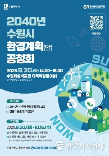 한국시사경제 사회팀 | 수원특례시는 9월 30일 오후 2시 수원화성박물관 다목적강당에서 ‘2040년 수원시 환경계획(안)’ 공청회를 열고, 시민 의견을 듣는다.
