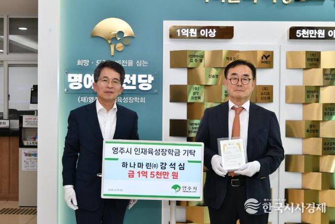 한국시사경제 경북취재본부 | (재)영주시인재육성장학회는 지난 26일, 하나마린㈜ 강석심 회장이 영주 지역 인재를 위한 장학금 1억 5천만 원을 기탁했다고 밝혔다.