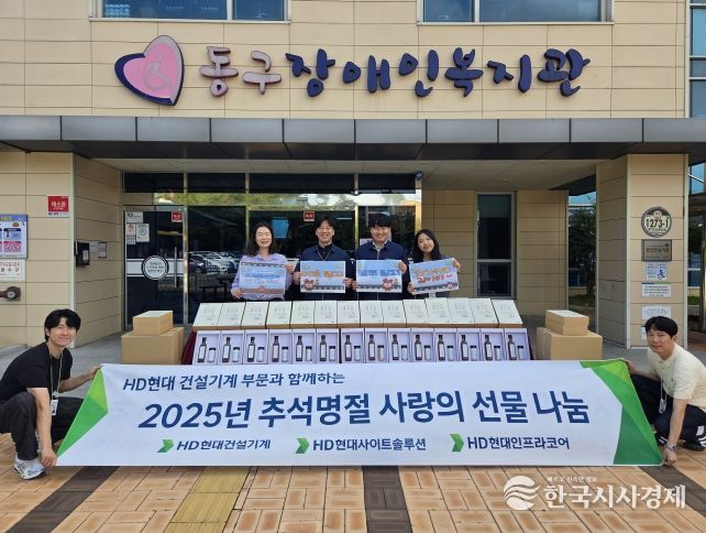 한국시사경제 울산취재본부 | HD현대건설기계(대표이사 최철곤)은 지난 26일 추석 명절을 맞이하여 울산광역시동구장애인복지관(관장 이태동, 이하 동구장애인복지관)에 170만원 상당의 명절선물 세트를 전달했다.