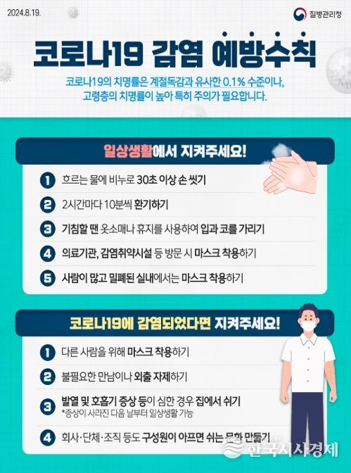 아울러, “추석 연휴를 건강하게 보내기 위해서는 우리 모두가 일상에서 손씻기, 주기적인 실내 환기, 기침 예절 준수 등 코로나19 감염 예방수칙을 실천하는 것이 무엇보다 중요하다.”고 전하고, “질병관리청은 코로나19 발생 상황을 지속해서 살피고, 필요한 정보를 적시에 공유할 것이며, 추석 연휴 기간에도 필요한 대응을 이어갈 것”이라고 밝혔다.
