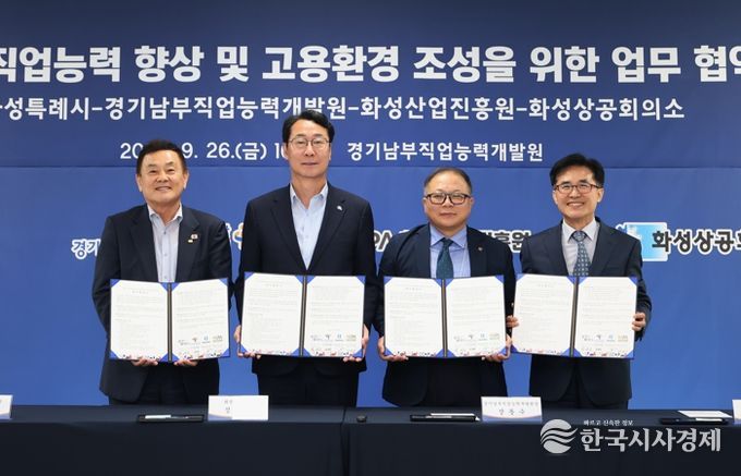 한국시사경제 문화팀 | 화성특례시가 26일 경기남부직업능력개발원·화성상공회의소·화성산업진흥원과 ‘장애인의 직업능력 향상 및 장애친화형 고용 환경 조성을 위한 업무협약’을 체결했다.