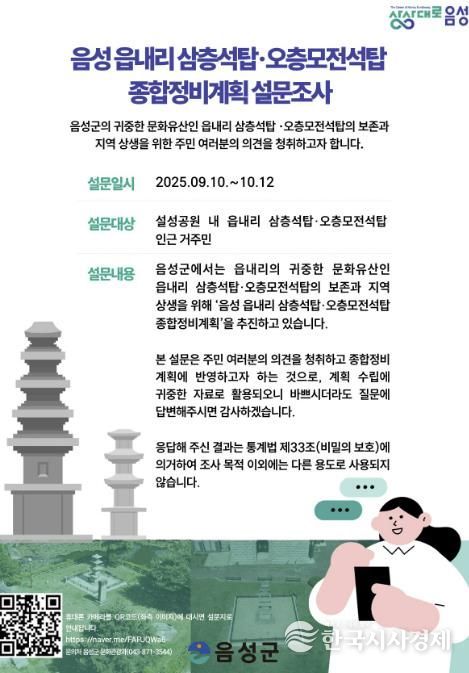 한국시사경제 오영주 기자 | 음성군은 읍내리 설성공원 일원에 위치한 ‘음성 읍내리 삼층석탑’ 및 ‘음성 읍내리 오층모전석탑’의 종합정비계획을 수립하는 과정에서 주민 의견 수렴을 위한 온라인 설문조사를 실시한다고 밝혔다.