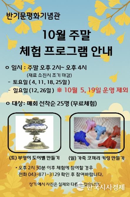 한국시사경제 오영주 기자 | 음성군 제8대 유엔사무총장 반기문 평화기념관에서는 관람객을 위해 10월 주말 무료 체험 프로그램을 운영한다.