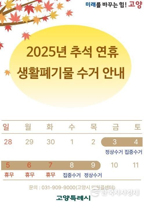 한국시사경제 권충현 기자 | 고양특례시는 다가오는 추석 연휴를 맞아 시민들이 쾌적하고 깨끗한 환경 속에서 명절을 보낼 수 있도록 ‘추석 연휴 생활쓰레기 관리대책’을 수립해 본격 추진한다.