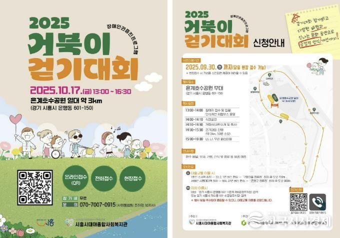 한국시사경제 경기취재본부 | 시흥시는 오는 10월 17일 오후 1시부터 은계호수공원 일대에서 장애인과 비장애인이 함께 걷고 소통하며 문화를 즐기는 ‘거북이 걷기대회’를 연다. 이번 행사는 시흥시대야종합사회복지관이 주관한다.