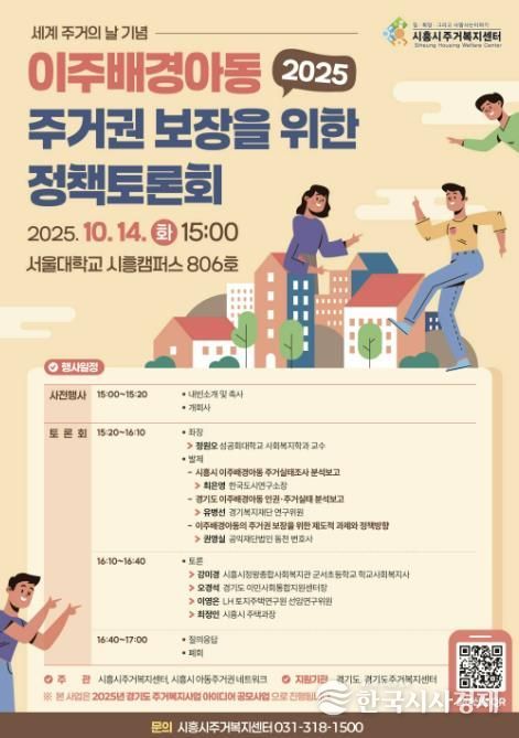 한국시사경제 경기취재본부 | 시흥시주거복지센터는 오는 10월 14일 오후 3시, 서울대학교 시흥캠퍼스 806호에서 ‘이주배경아동 주거권 보장을 위한 정책토론회’를 개최한다.