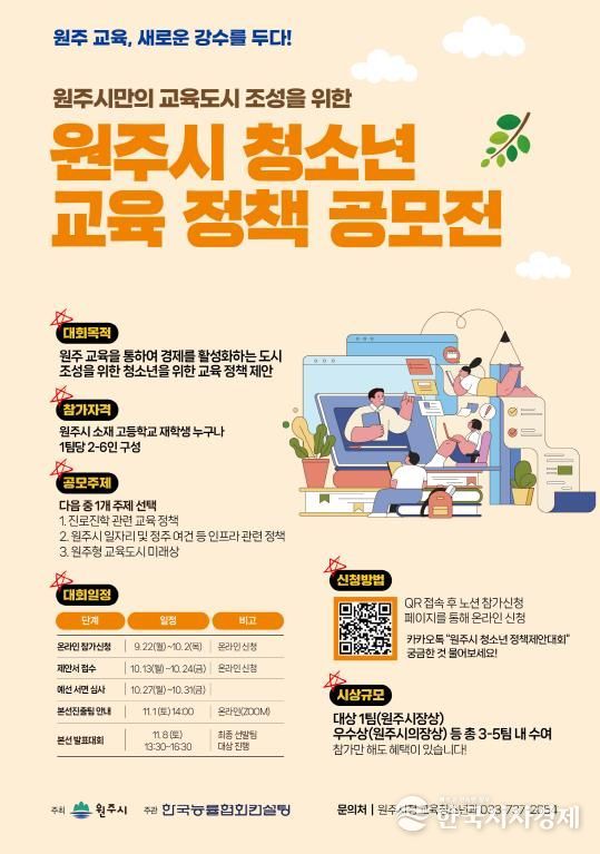 한국시사경제 권충언 기자 | 원주시는 지역 청소년들이 직접 제안한 정책을 바탕으로 교육도시 비전을 함께 만들기 위해 ‘원주시 청소년 교육 정책 공모전’을 추진한다.